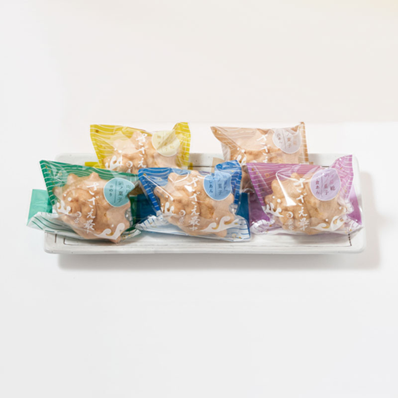 南房総で獲れる「さざえ」をモチーフにした最中。外はパリッと香ばしく、中には北海道産「大納言小豆」を使った優しい甘さのあんこが詰まっています。小倉・白あん・こしあん・ゆずあん・青のりあんの5種類があります。