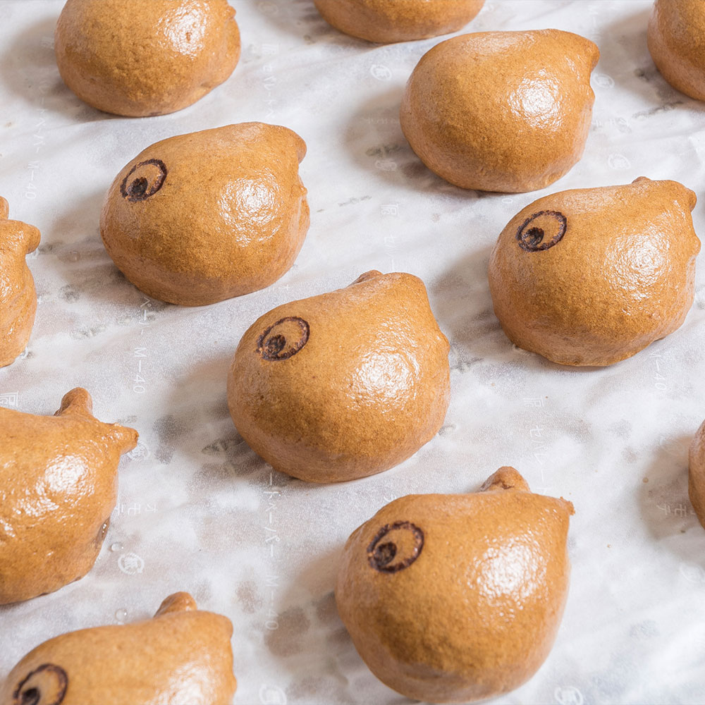 薄皮にあんこいっぱいのおまんじゅうは、ひとつひとつ手作りなのでちょっとずつ形や顔が違います。